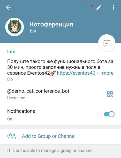 Для этого зайдите в бота, нажмите на название и перейдите в режим редактирования нажав на карандашик (на телефоне) или на три точки и Manage bot (на ноутбуке):