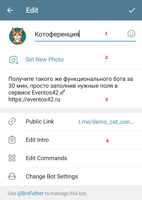 Так же все параметры можно изменить в https://t.me/BotFather через специализированные команды, которые можно найти в самом боте.
