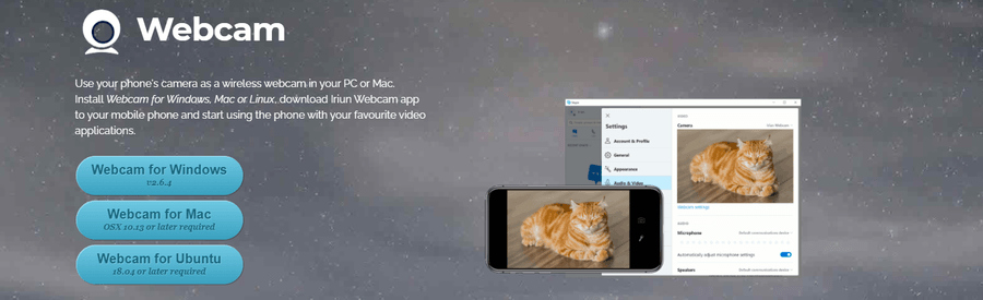 - Зайдите на сайт https://iriun.com/index.html и скачайте программу для нужной вам операционной системы ноутбука (Windows, Mac, Ubuntu).